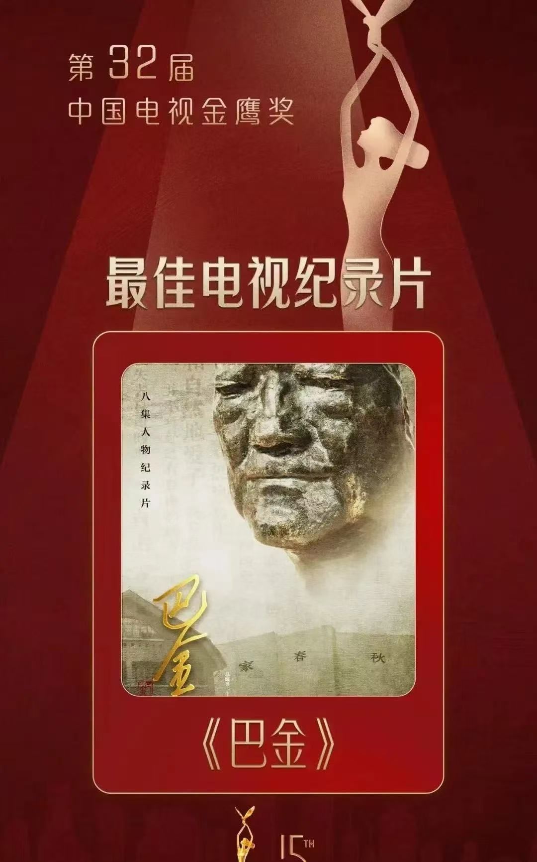 吉艺等单位联合制作的纪录片《巴金》获第32届中国电视金鹰奖最佳纪录片大奖